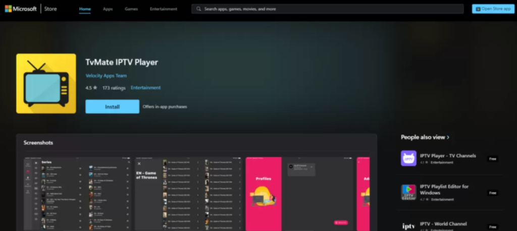 För att börja använda den bästa IPTV-spelaren för Windows, gå till Microsoft Store och sök efter “TiviMate IPTV Player”. Klicka på knappen “Installera” för att ladda ner och installera appen. Du kan också komma åt den direkt via denna länk: Ladda ner TiviMate IPTV Player.